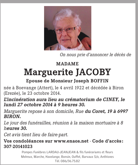 Décédé à Biron (6997) le jeudi 23 octobre 2014 à l'âge de 92 ans