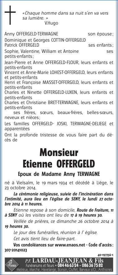 Décédé à Liège (4000) le jeudi 23 octobre 2014 à l'âge de 80 ans