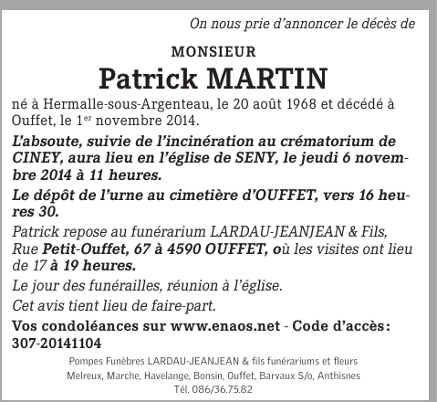 Décédé à Ouffet (4590) le mardi 4 novembre 2014 à l'âge de 46 ans