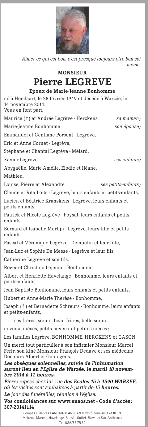 Décédé à Warzée (4590) le vendredi 14 novembre 2014 à l'âge de 65 ans