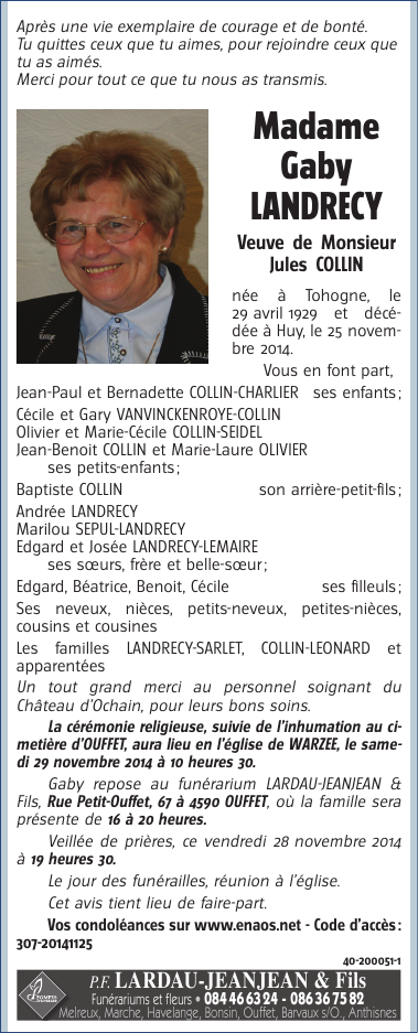 Décédé à Huy (4500) le mardi 25 novembre 2014 à l'âge de 85 ans