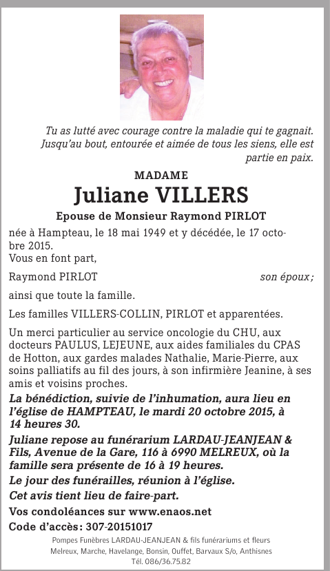 Décédée à Hampteau (6990) le samedi 17 octobre 2015 à l'âge de 66 ans