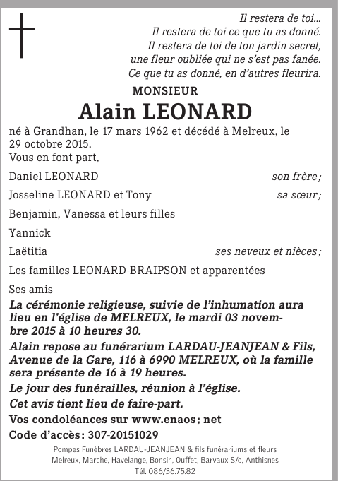 Décédé à Melreux (6990) le jeudi 29 octobre 2015 à l'âge de 53 ans
