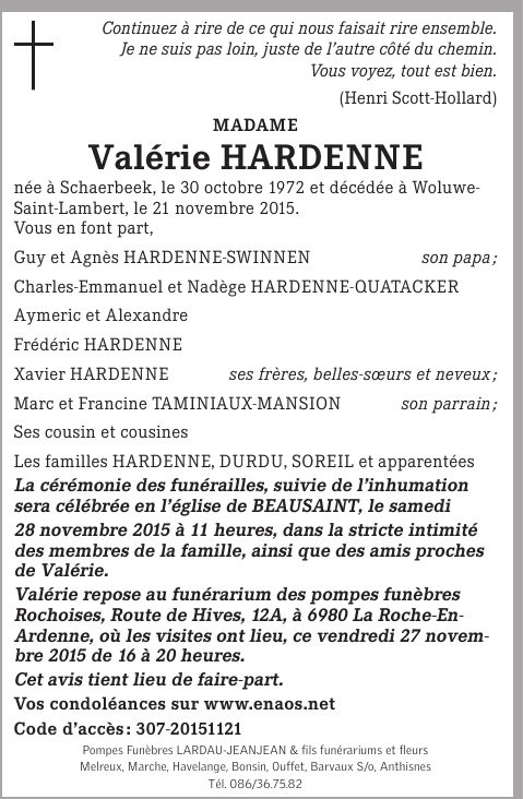 Décédée à Bruxelles (Woluwe-Saint-Lambert) (1200) le jeudi 26 novembre 2015 à l'âge de 43 ans