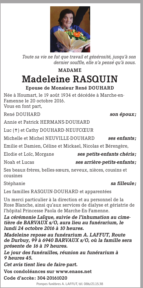 Décédée à Marche-en-Famenne (6900) le jeudi 20 octobre 2016 à l'âge de 82 ans
