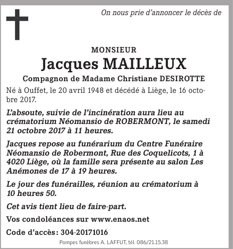 Décédé à Liège (4000) le jeudi 19 octobre 2017 à l'âge de 69 ans