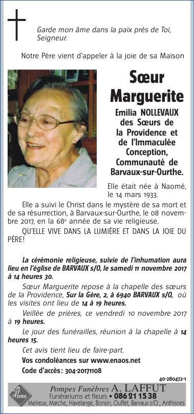Décédée à Barvaux-sur-Ourthe (6940) le mercredi 8 novembre 2017 à l'âge de 84 ans