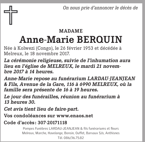 Décédée à Melreux (6990) le samedi 18 novembre 2017 à l'âge de 64 ans