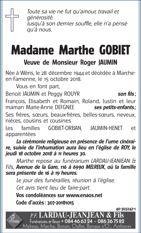 Décédée à Marche-en-Famenne (6900) le lundi 15 octobre 2018 à l'âge de 73 ans