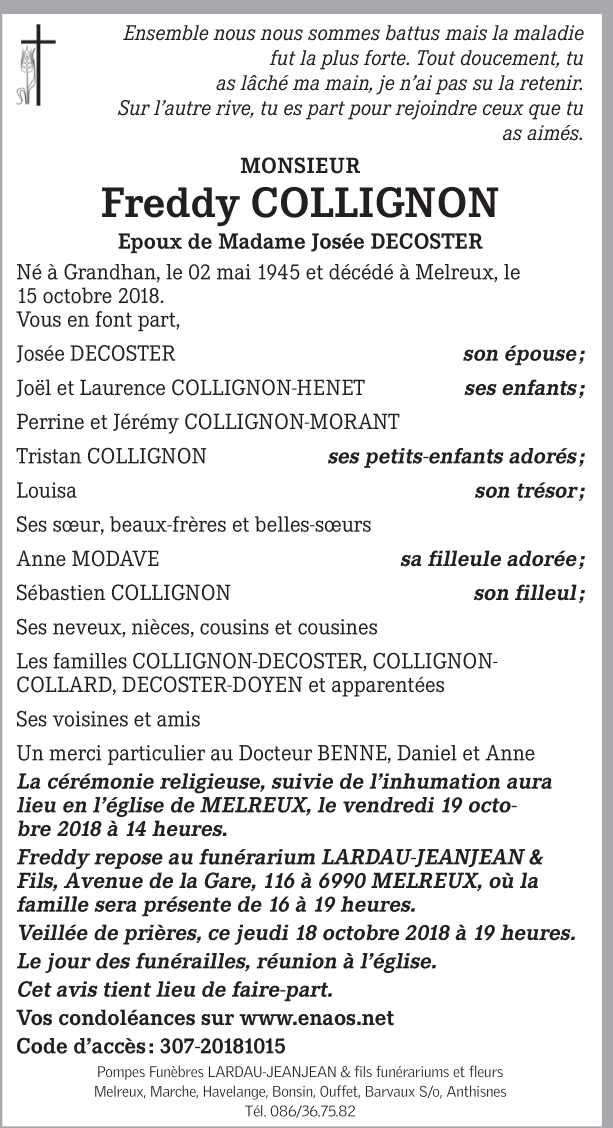 Décédé à Melreux (6990) le mardi 16 octobre 2018 à l'âge de 73 ans