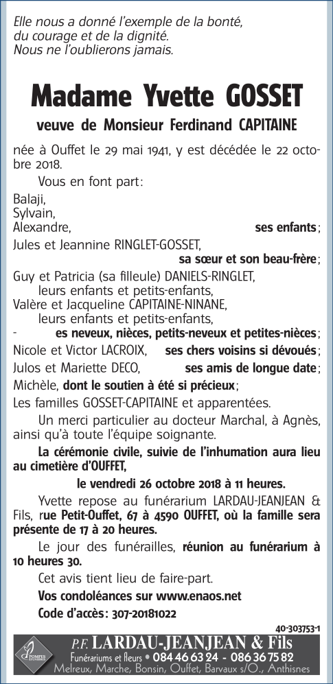 Décédée à Ouffet (4590) le lundi 22 octobre 2018 à l'âge de 77 ans