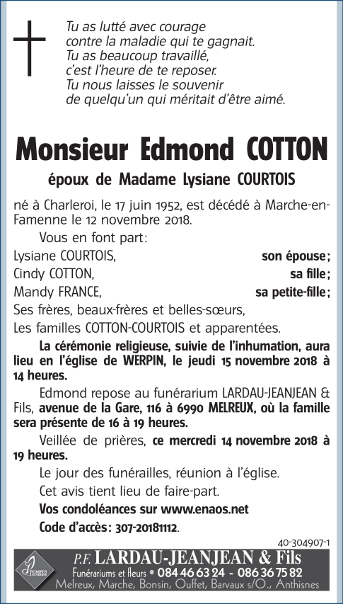 Décédé à Marche-en-Famenne (6900) le lundi 12 novembre 2018 à l'âge de 66 ans