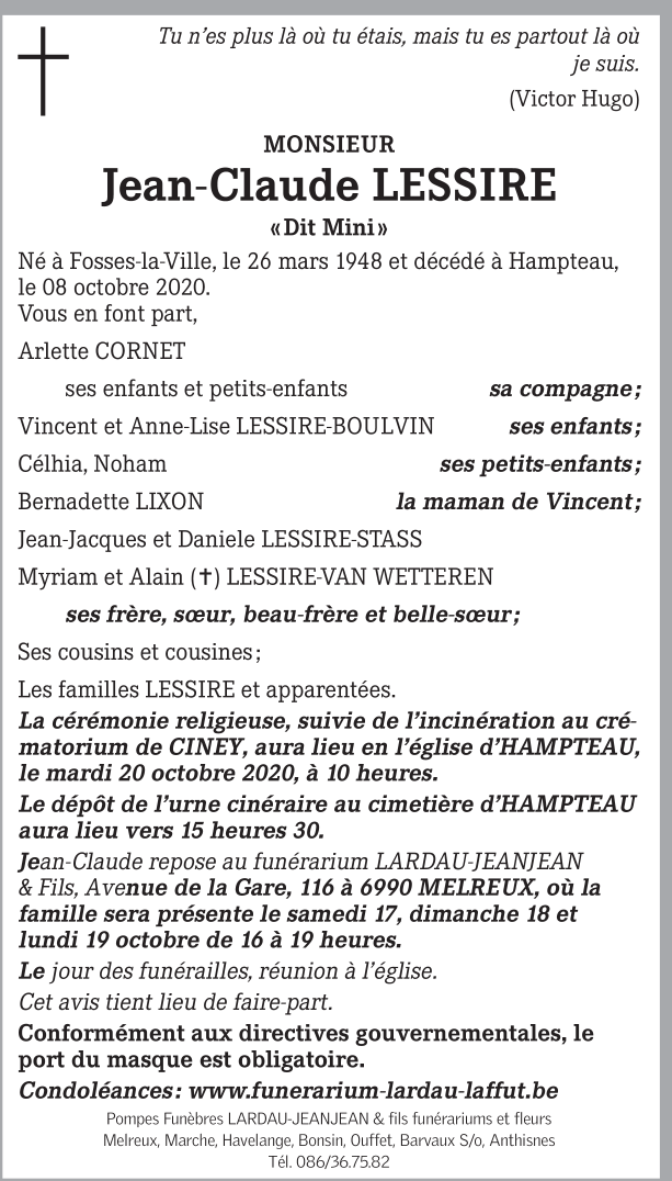 Décédé à Hampteau (6990) le vendredi 16 octobre 2020 à l'âge de 72 ans