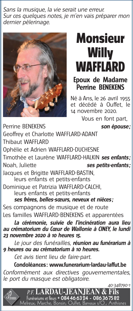 Décédé à Ouffet (4590) le samedi 14 novembre 2020 à l'âge de 65 ans