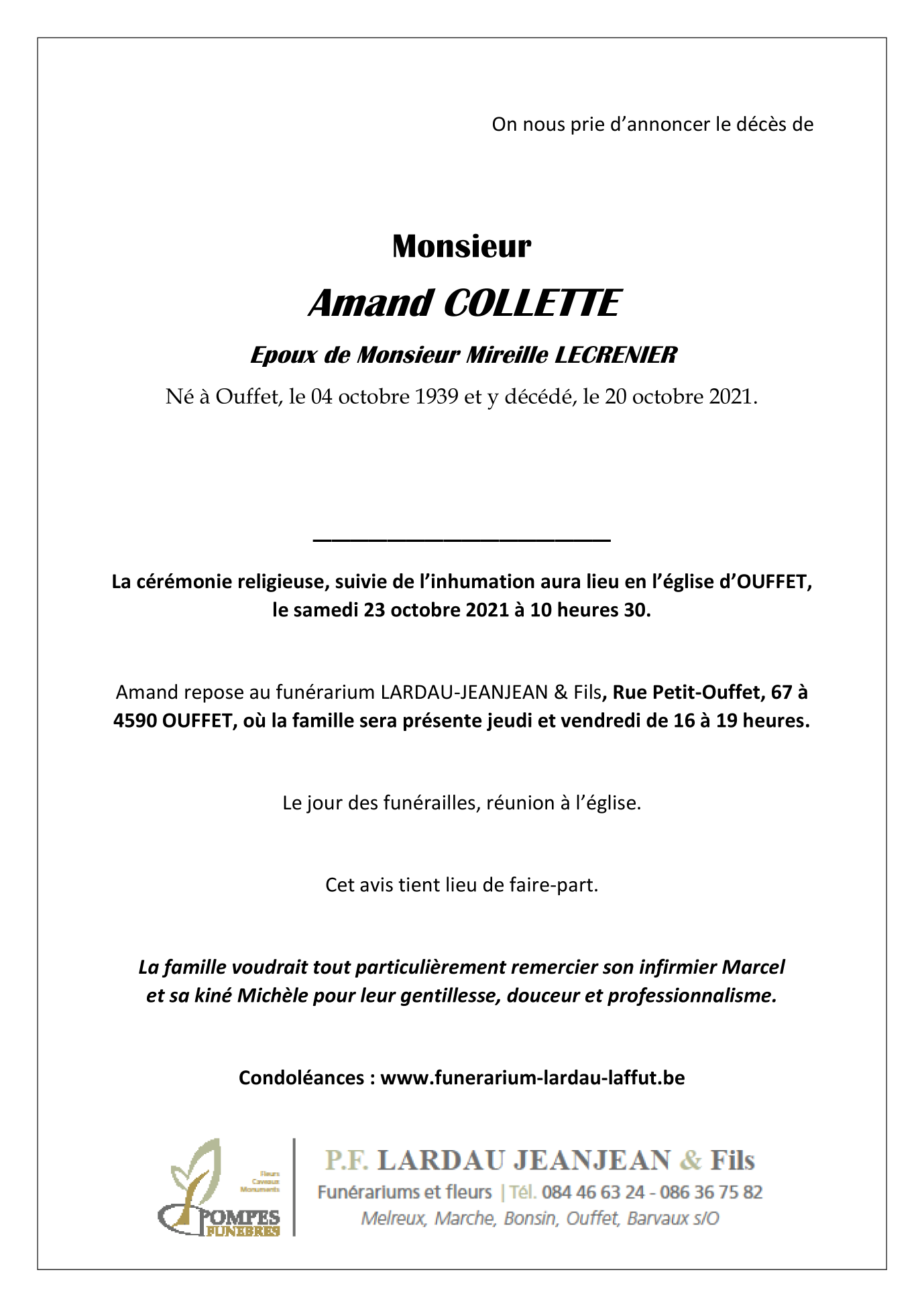 Décédé à Ouffet (4590) le mercredi 20 octobre 2021 à l'âge de 82 ans