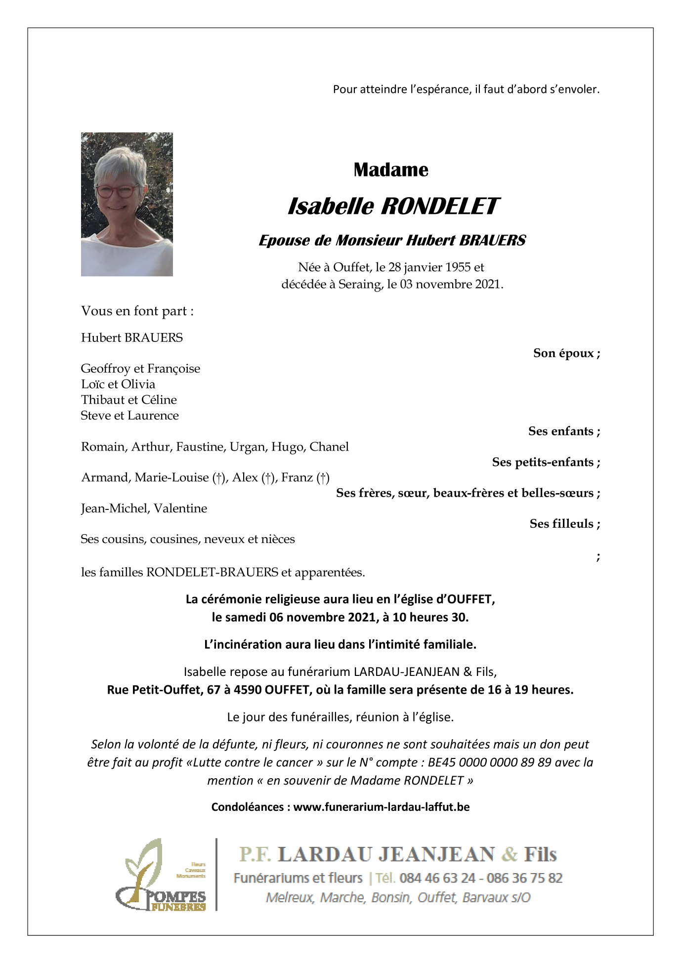 Décédée à Seraing (4100) le mercredi 3 novembre 2021 à l'âge de 66 ans