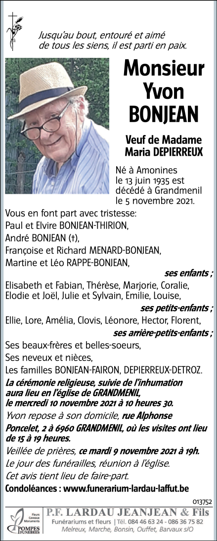 Décédé à Grandmenil (6960) le vendredi 5 novembre 2021 à l'âge de 86 ans