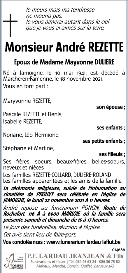 Décédé à Marche-en-Famenne (6900) le jeudi 18 novembre 2021 à l'âge de 80 ans