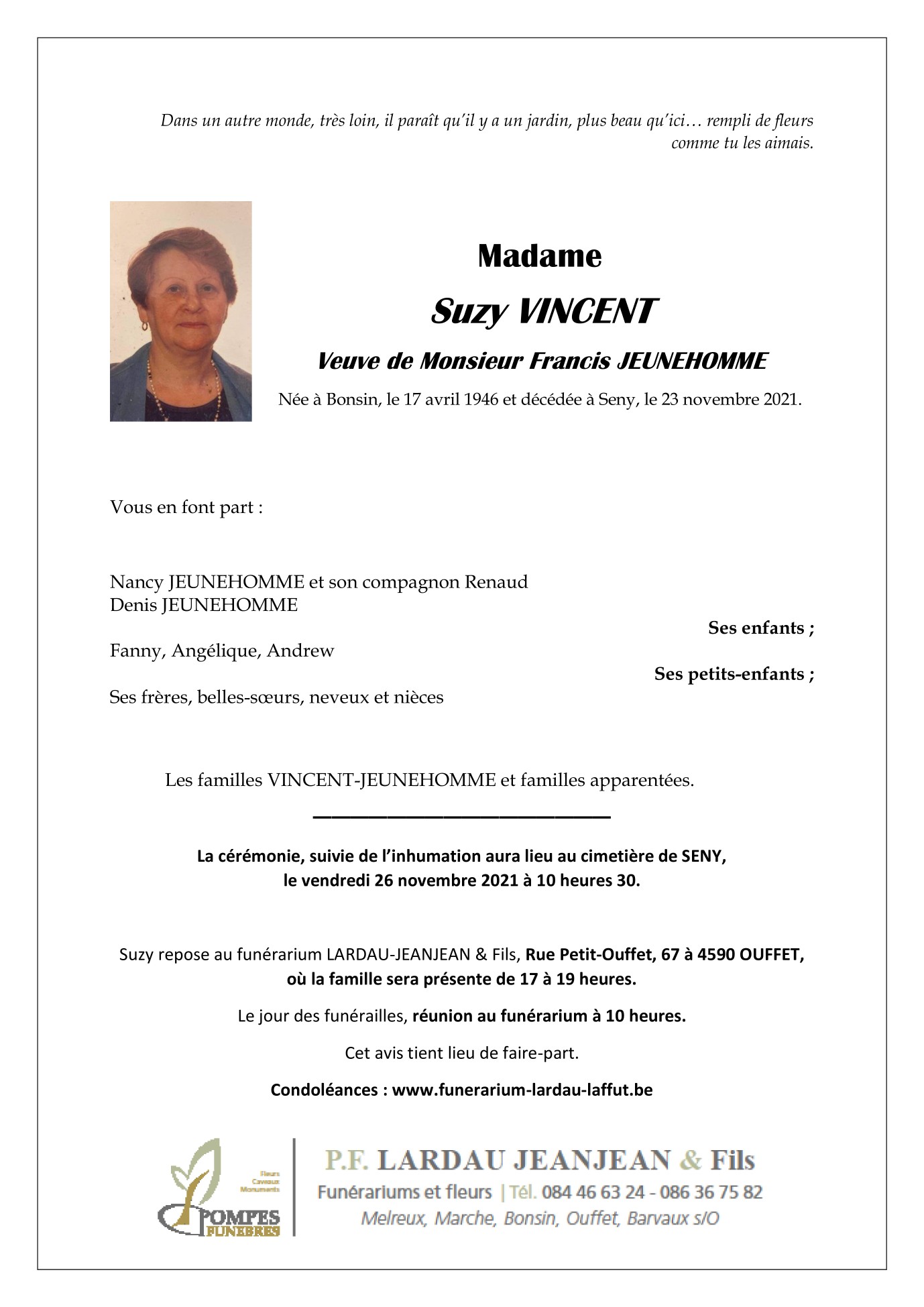 Décédée à Seny (4557) le mardi 23 novembre 2021 à l'âge de 75 ans