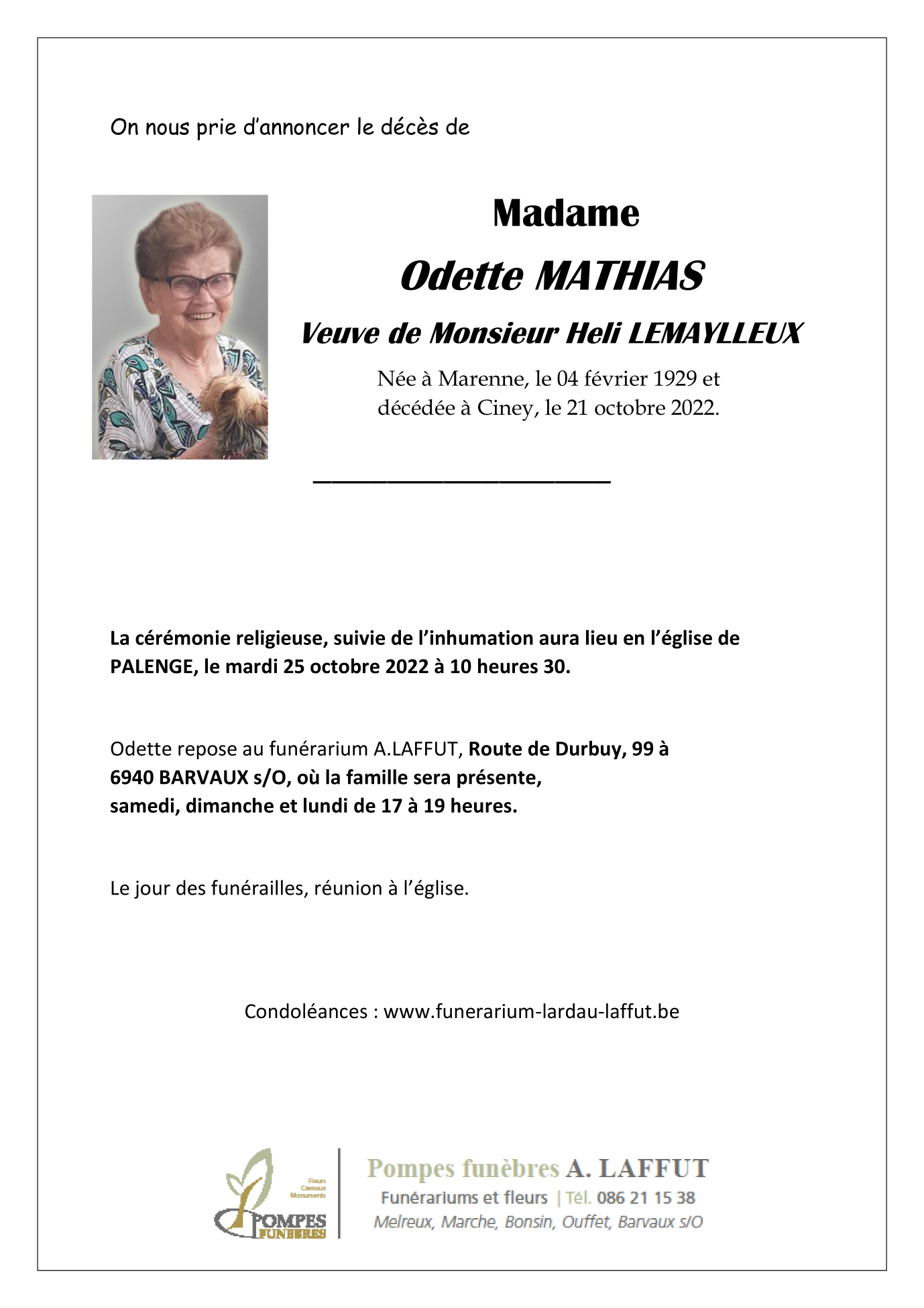 Décédée à Ciney (5590) le vendredi 21 octobre 2022 à l'âge de 93 ans
