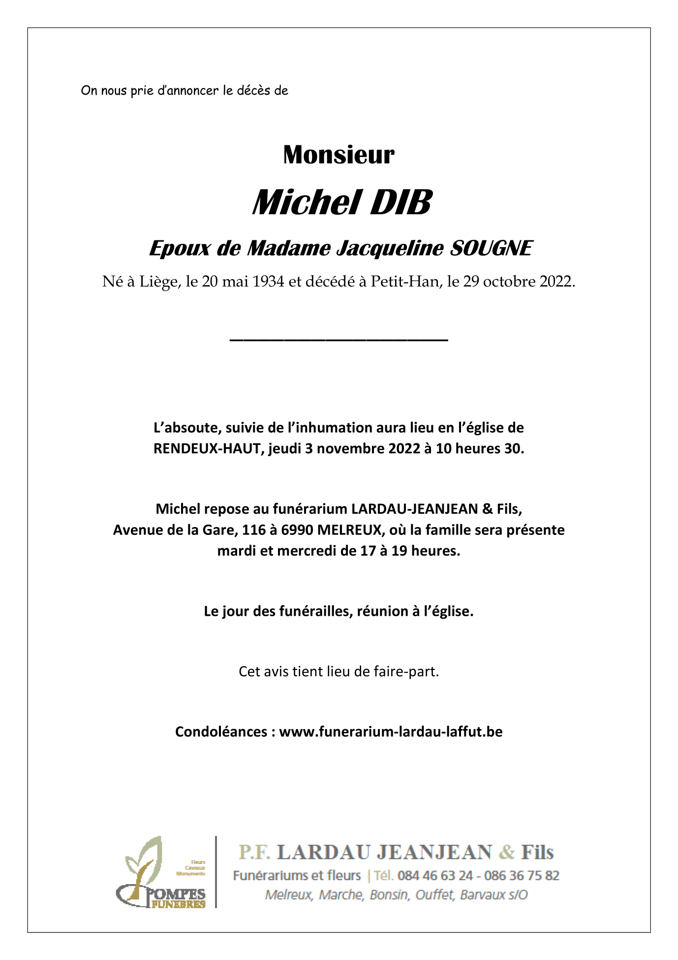 Décédé à Petit-Han (6940) le samedi 29 octobre 2022 à l'âge de 88 ans