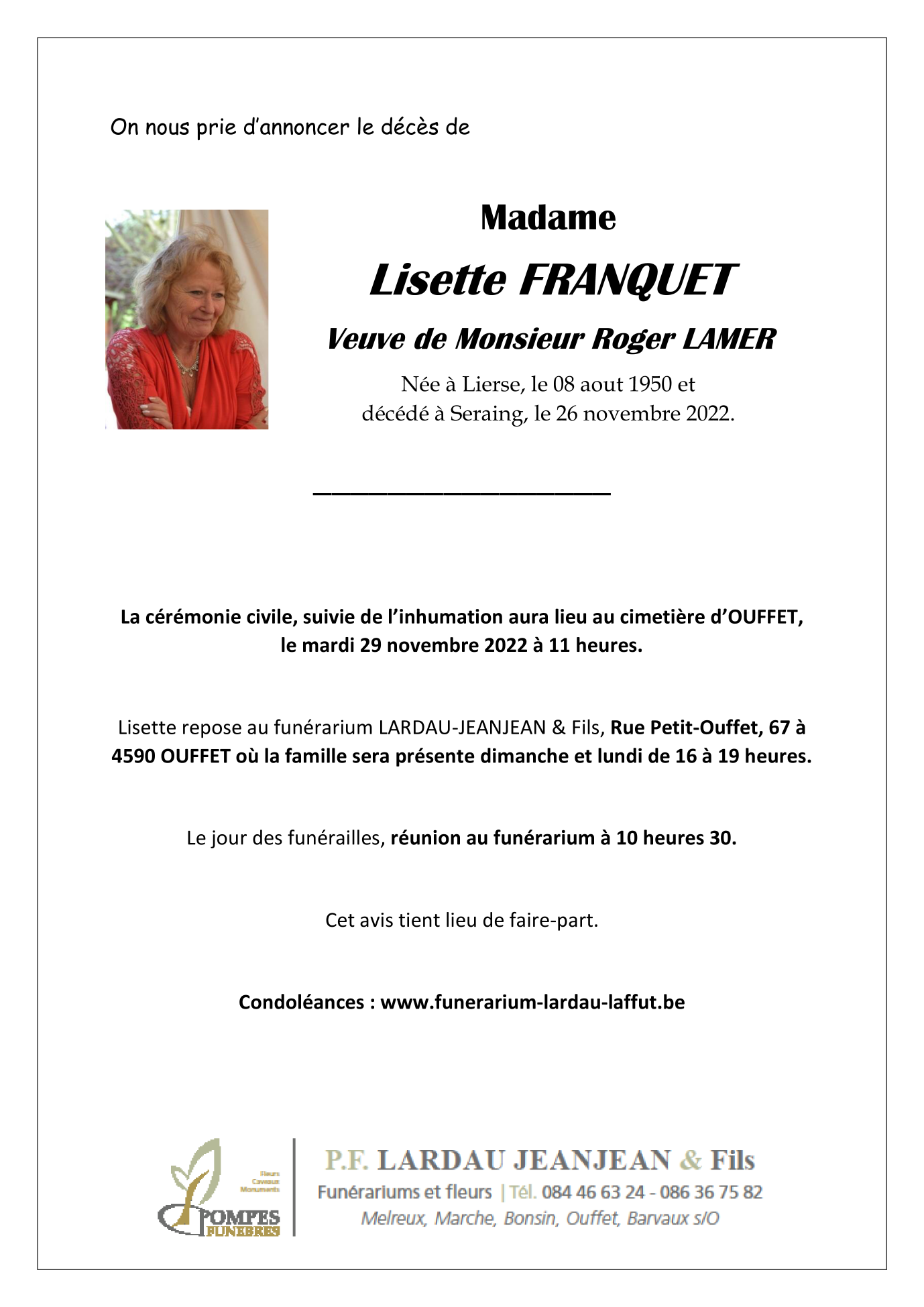 Décédée à Seraing (4100) le samedi 26 novembre 2022 à l'âge de 72 ans