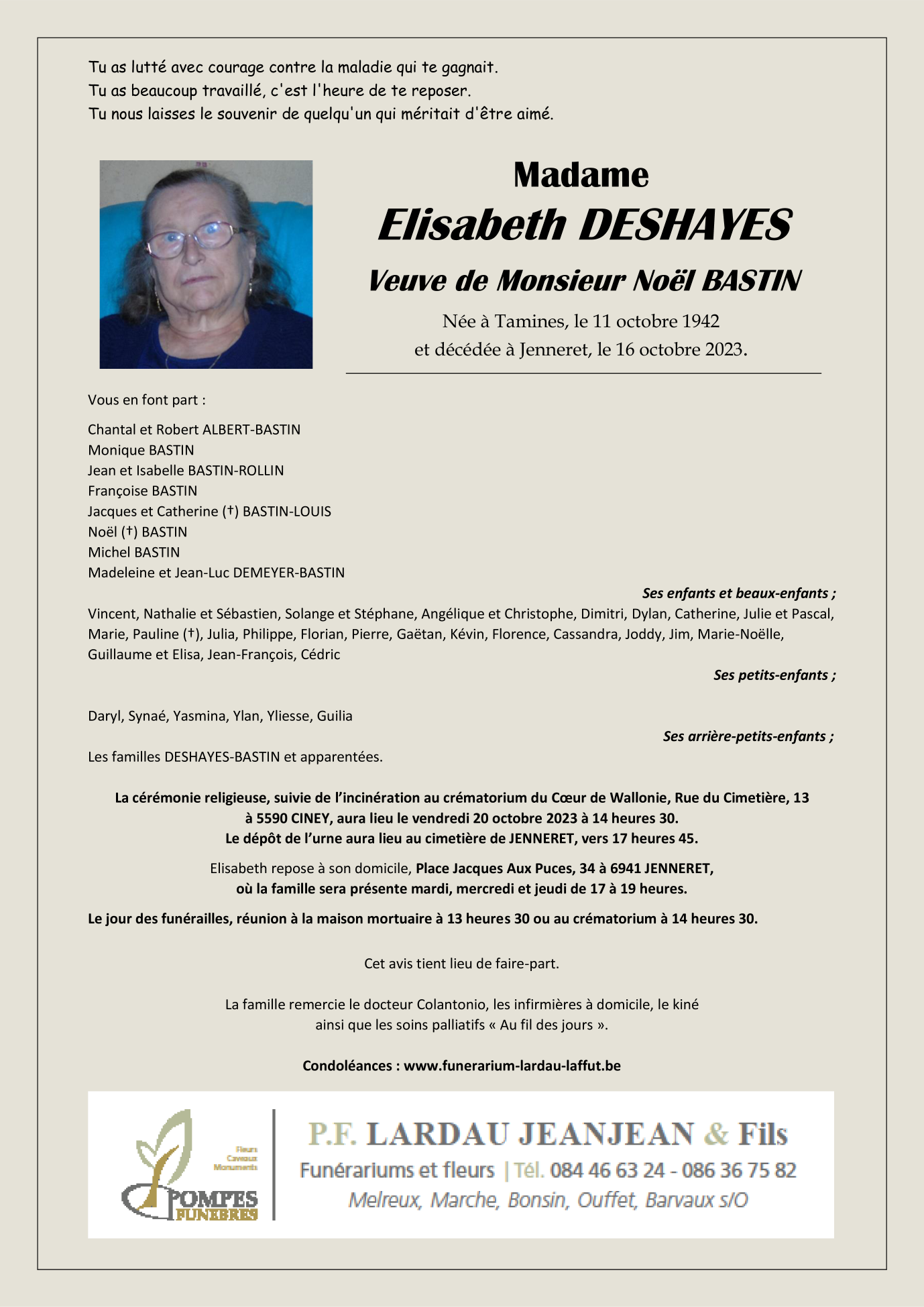 Décédée à Jenneret (6941) le lundi 16 octobre 2023 à l'âge de 81 ans