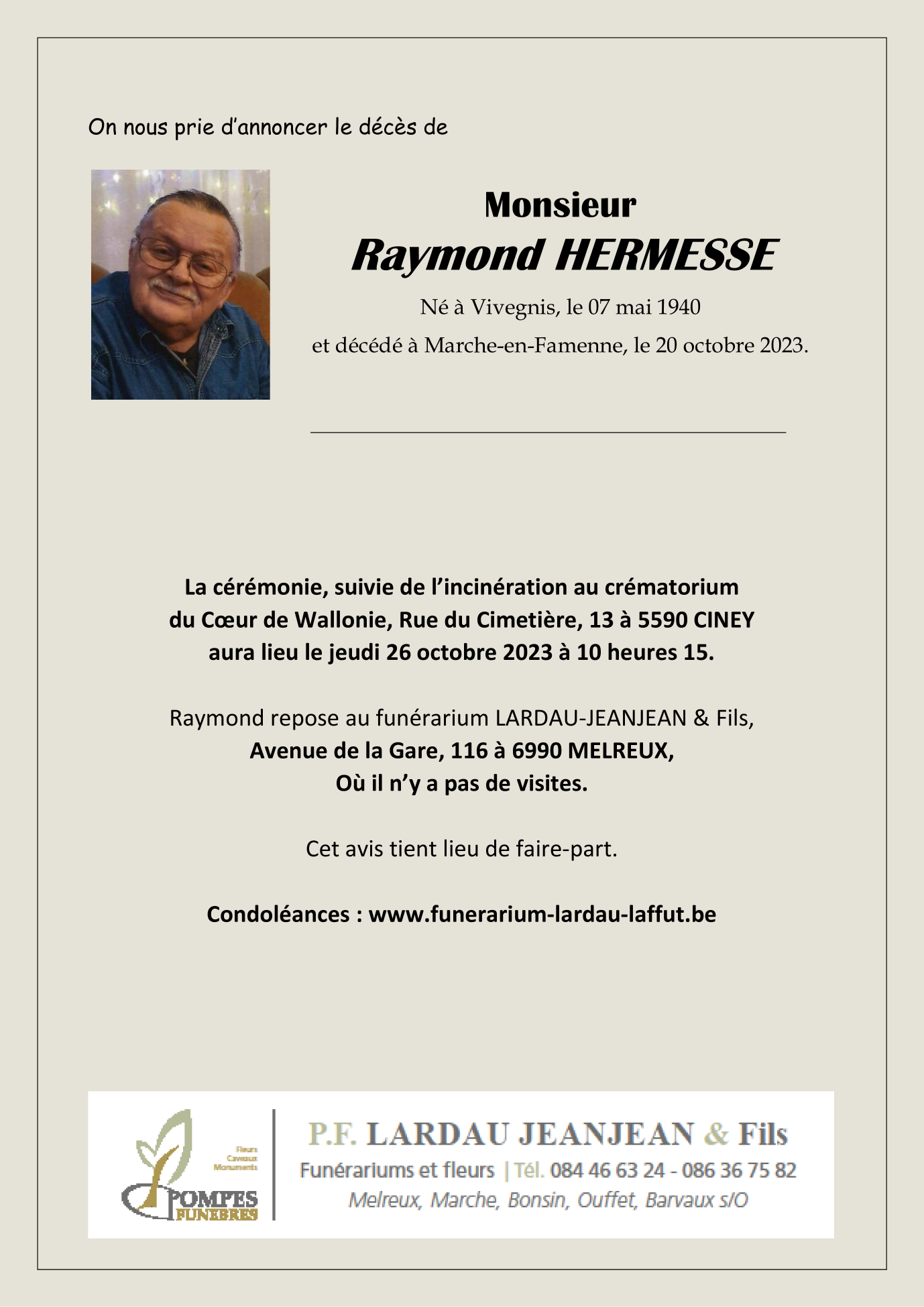 Décédé à Marche-en-Famenne (6900) le vendredi 20 octobre 2023 à l'âge de 83 ans