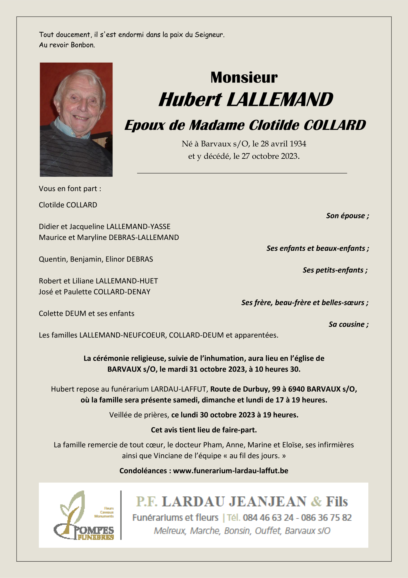 Décédé à Barvaux-sur-Ourthe (6940) le vendredi 27 octobre 2023 à l'âge de 89 ans