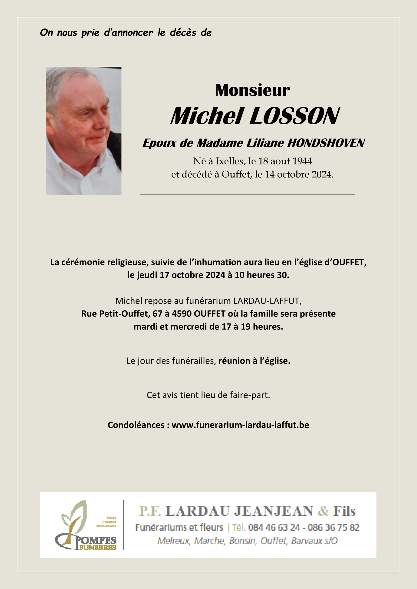 Décédé à Ouffet (4590) le lundi 14 octobre 2024 à l'âge de 80 ans