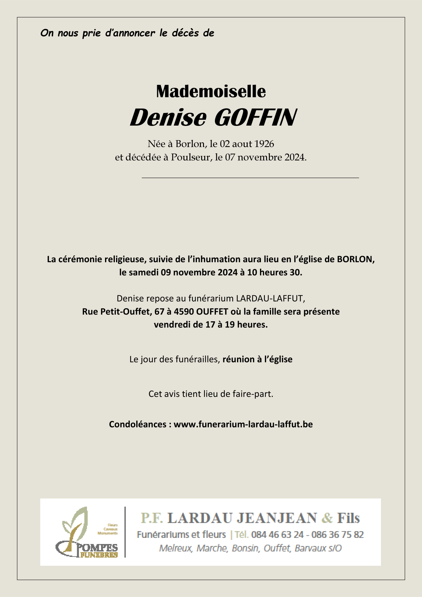 Décédée à Poulseur (4171) le jeudi 7 novembre 2024 à l'âge de 98 ans