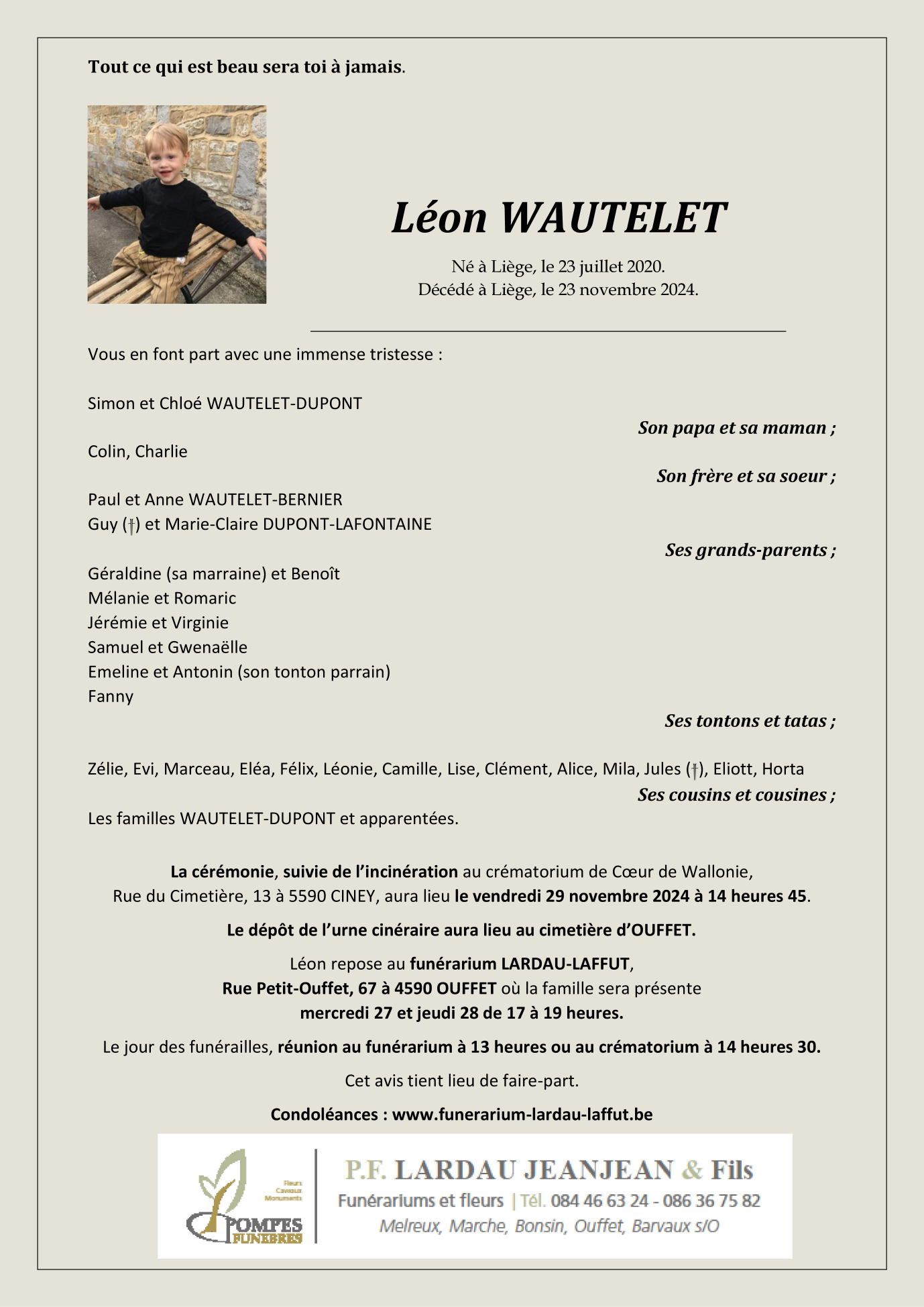 Décédé à Liège (4000) le samedi 23 novembre 2024 à l'âge de 4 ans