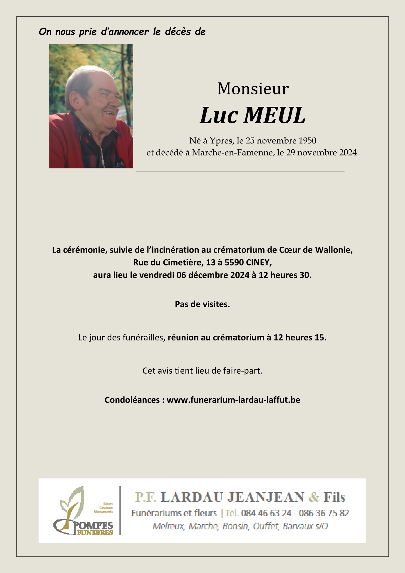 Décédé à Marche-en-Famenne (6900) le vendredi 29 novembre 2024 à l'âge de 74 ans