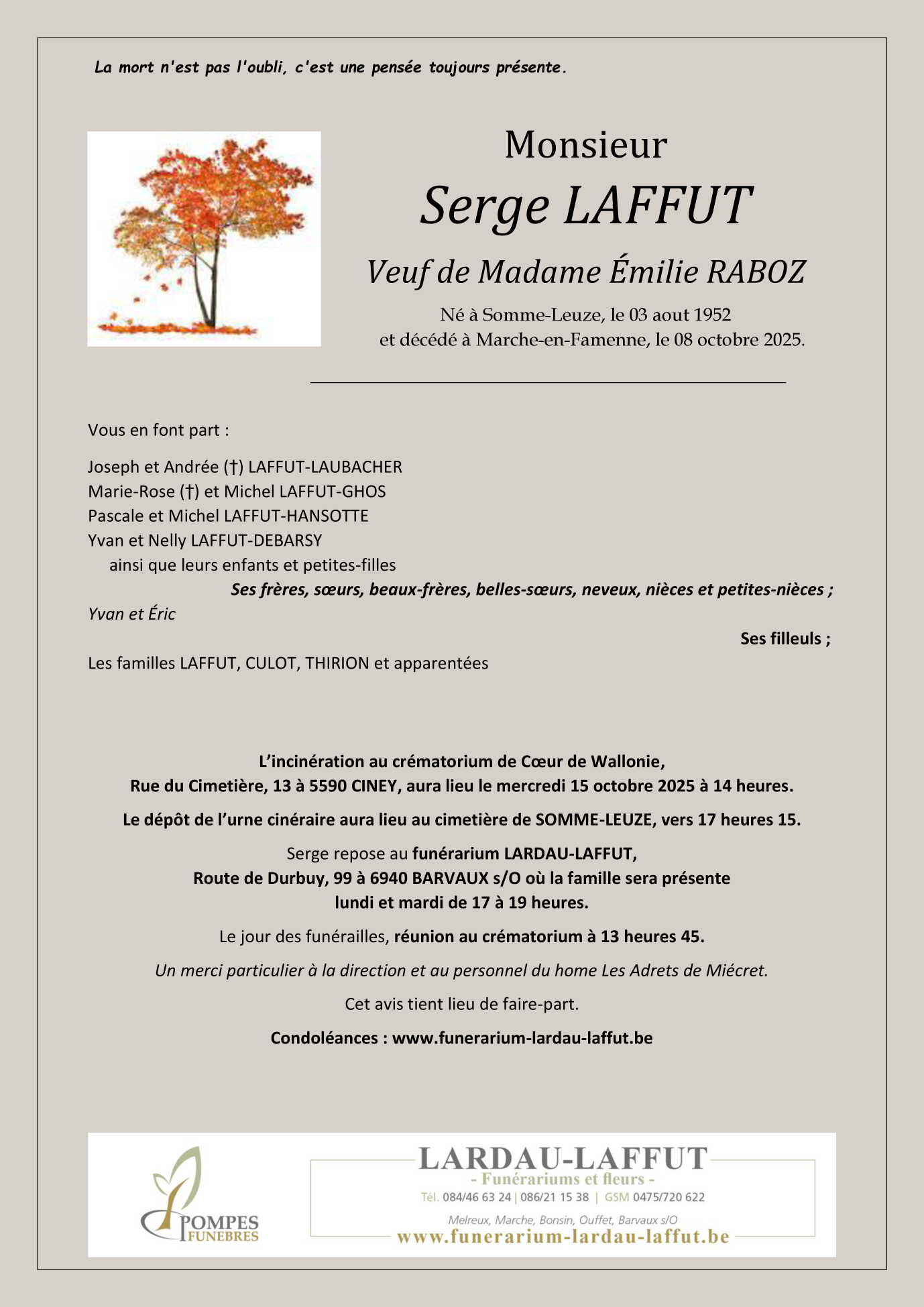 Décédé à Marche-en-Famenne (6900) le mercredi 8 octobre 2025 à l'âge de 73 ans