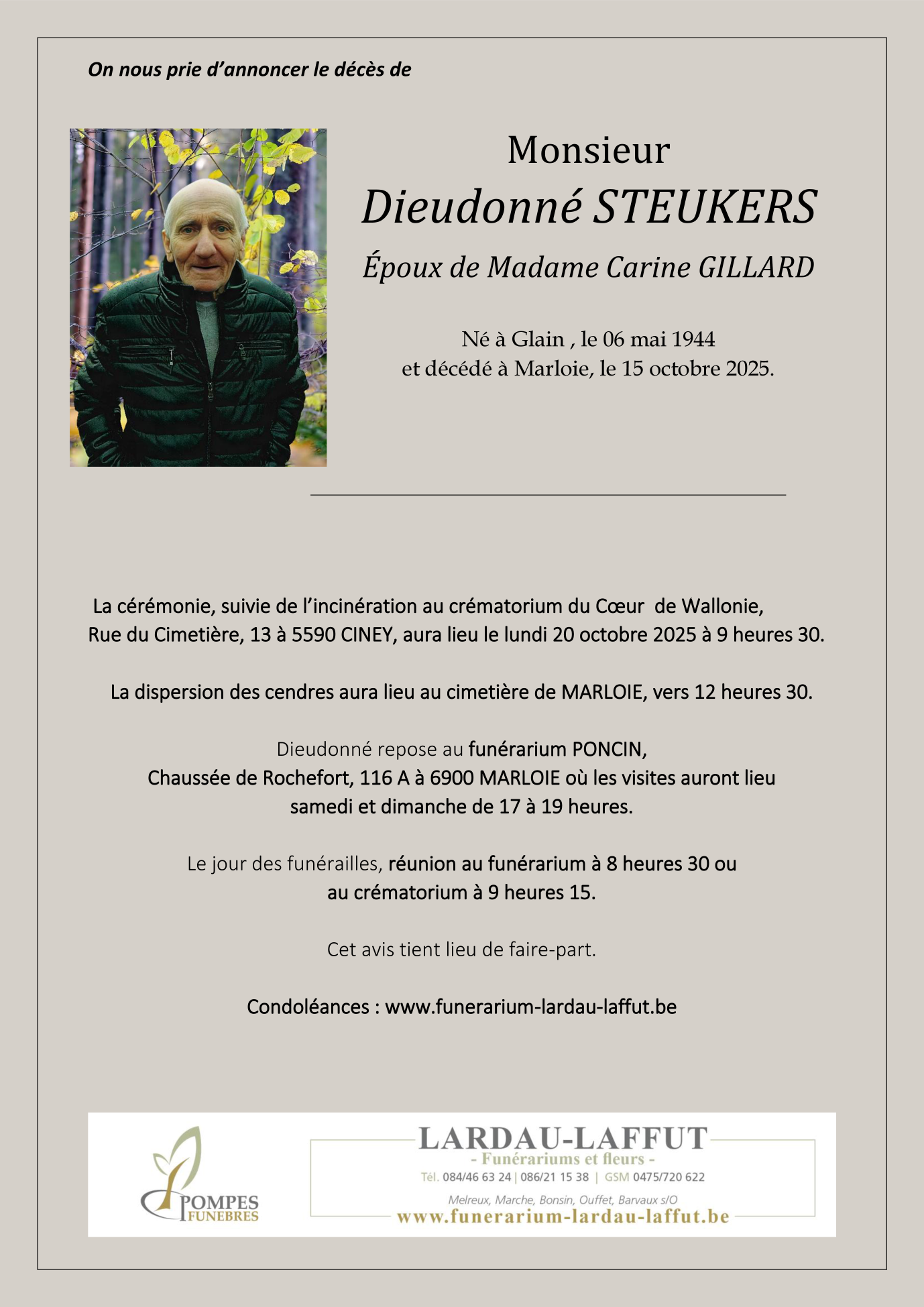 Décédé à Marloie (6900) le mercredi 15 octobre 2025 à l'âge de 81 ans