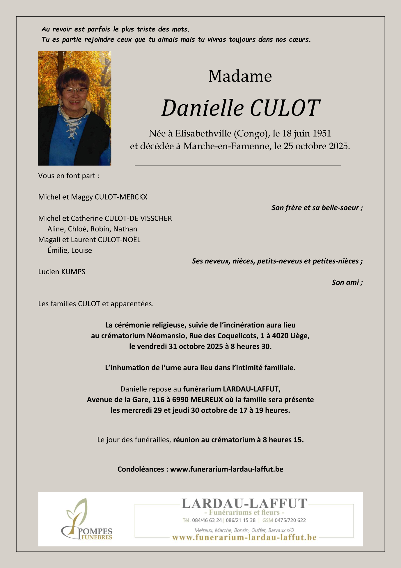 Décédée à Marche-en-Famenne (6900) le samedi 25 octobre 2025 à l'âge de 74 ans