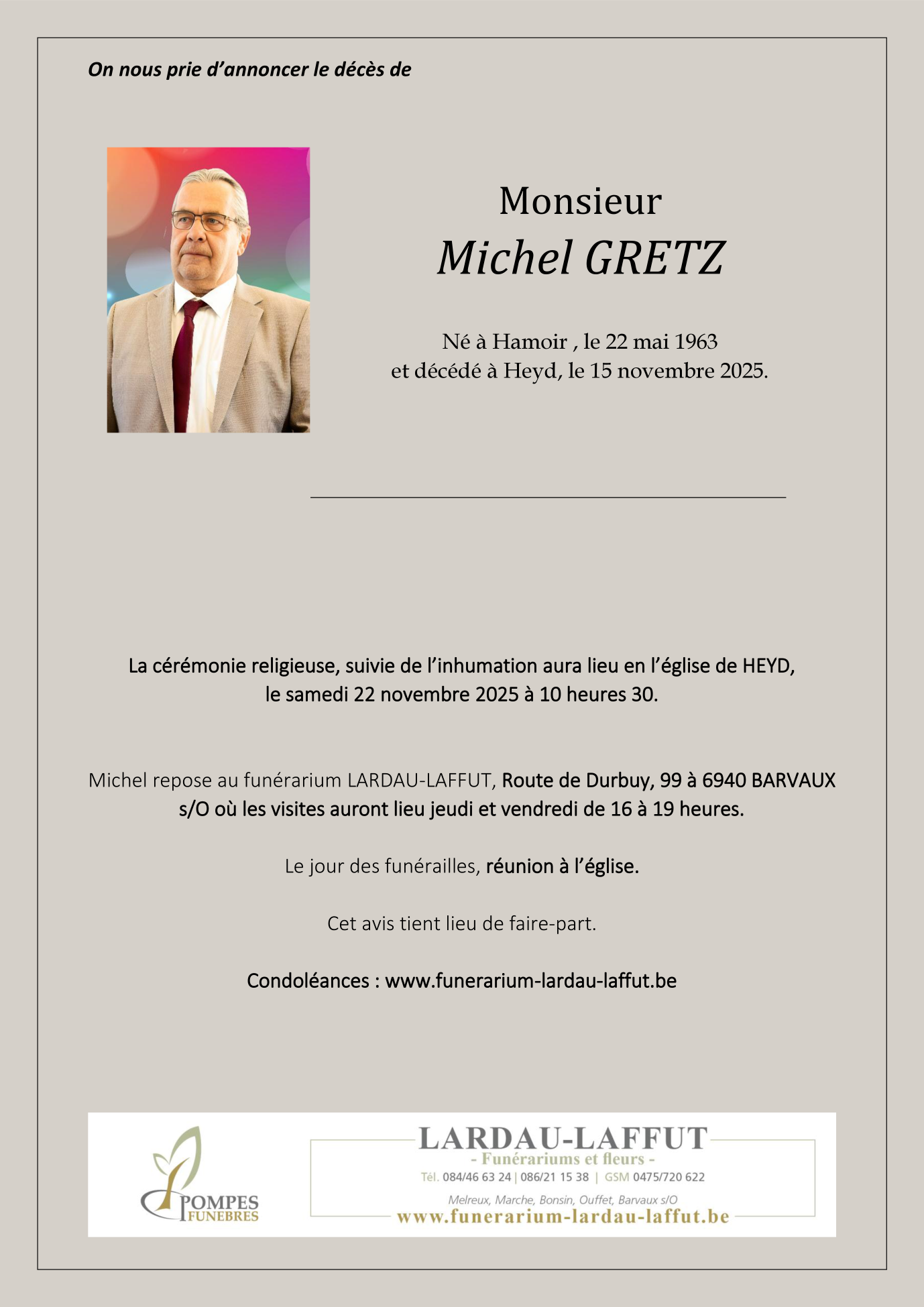 Décédé à Heyd (6941) le samedi 15 novembre 2025 à l'âge de 62 ans