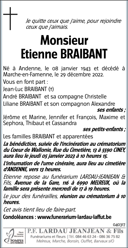 Décédé à Marche-en-Famenne (6900) le jeudi 29 décembre 2022 à l'âge de 79 ans