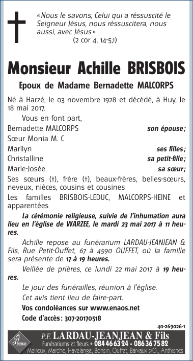 Décédé à Huy (4500) le jeudi 18 mai 2017 à l'âge de 88 ans