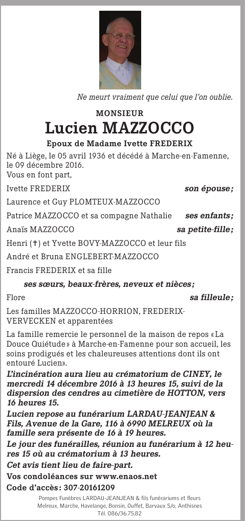 Décédé à Marche-en-Famenne (6900) le vendredi 9 décembre 2016 à l'âge de 80 ans