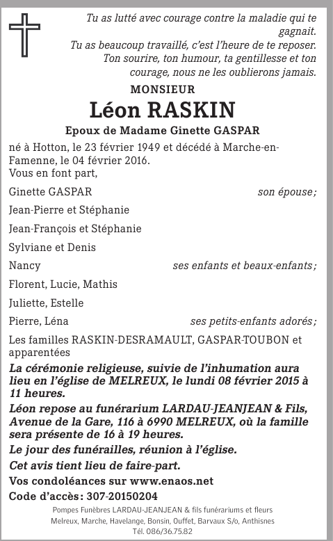 Décédé à Marche-en-Famenne (6900) le vendredi 5 février 2016 à l'âge de 66 ans