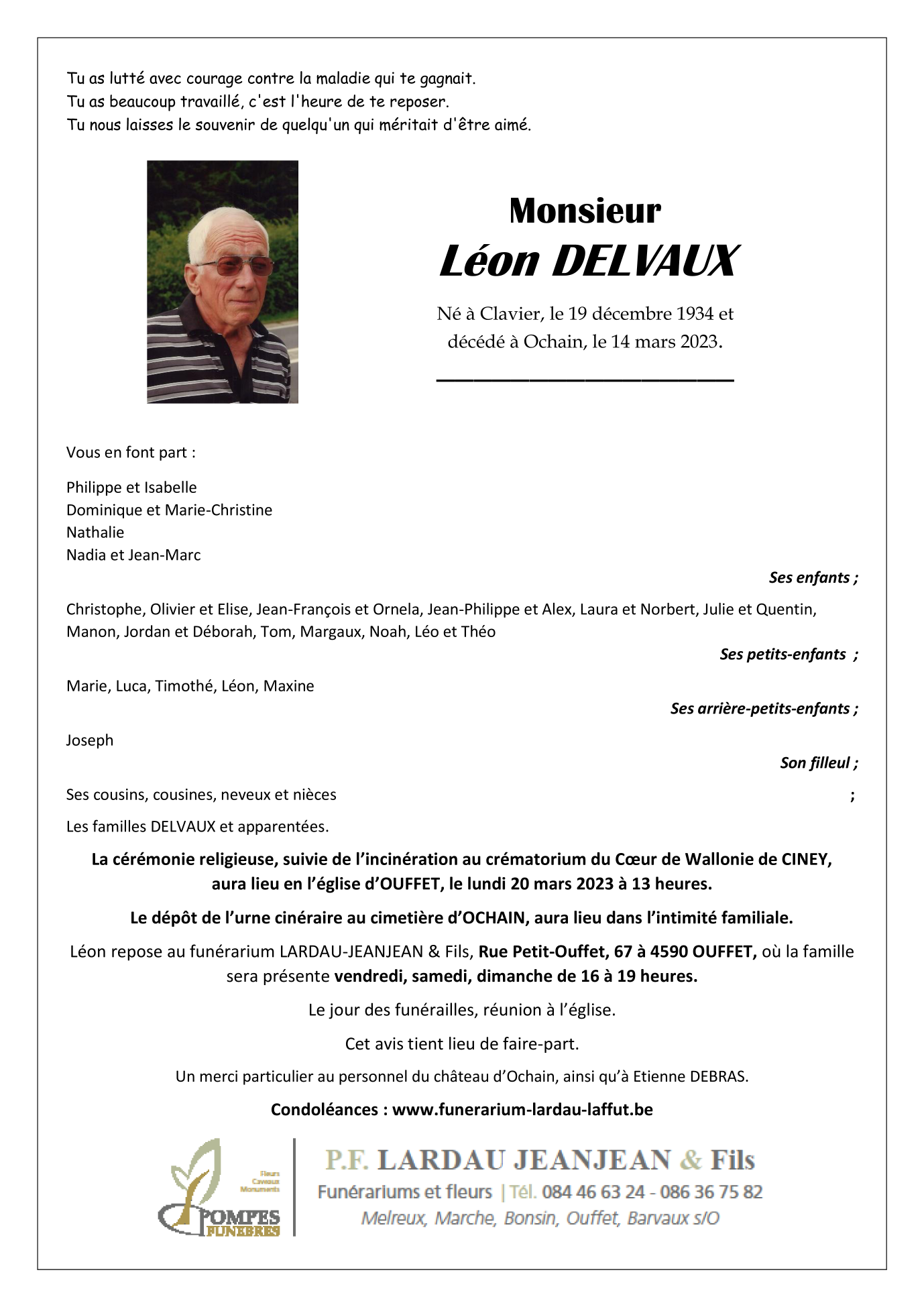 Décédé à Ochain (4560) le mardi 14 mars 2023 à l'âge de 88 ans