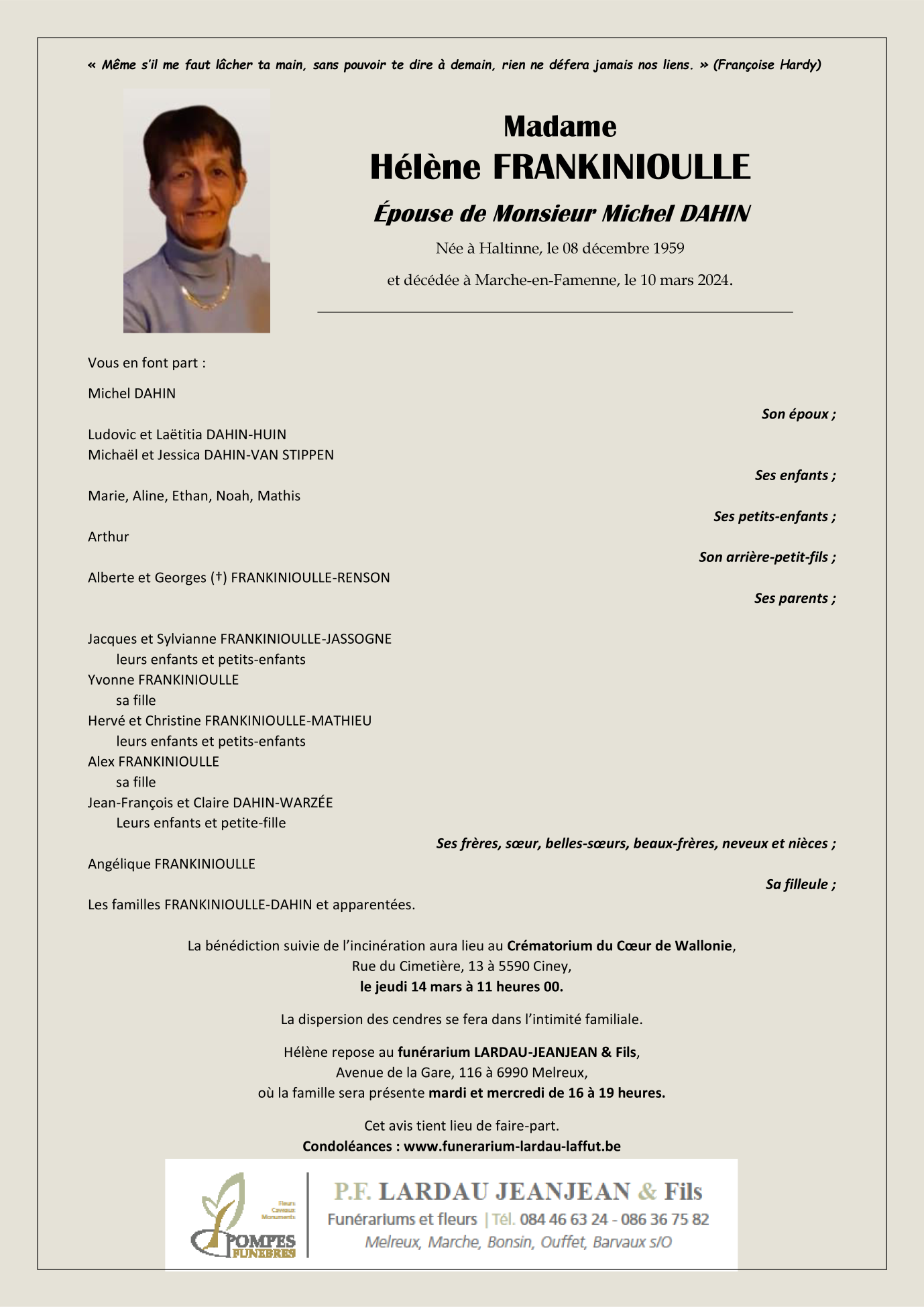 Décédée à Marche-en-Famenne (6900) le dimanche 10 mars 2024 à l'âge de 64 ans