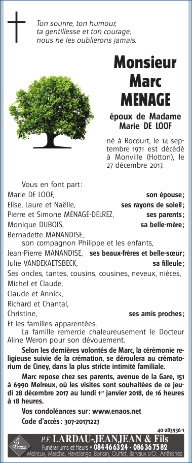 Décédé à Monville (6990) le mercredi 27 décembre 2017 à l'âge de 46 ans