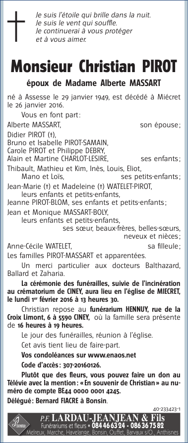 Décédé à Miécret (5376) le mardi 26 janvier 2016 à l'âge de 66 ans