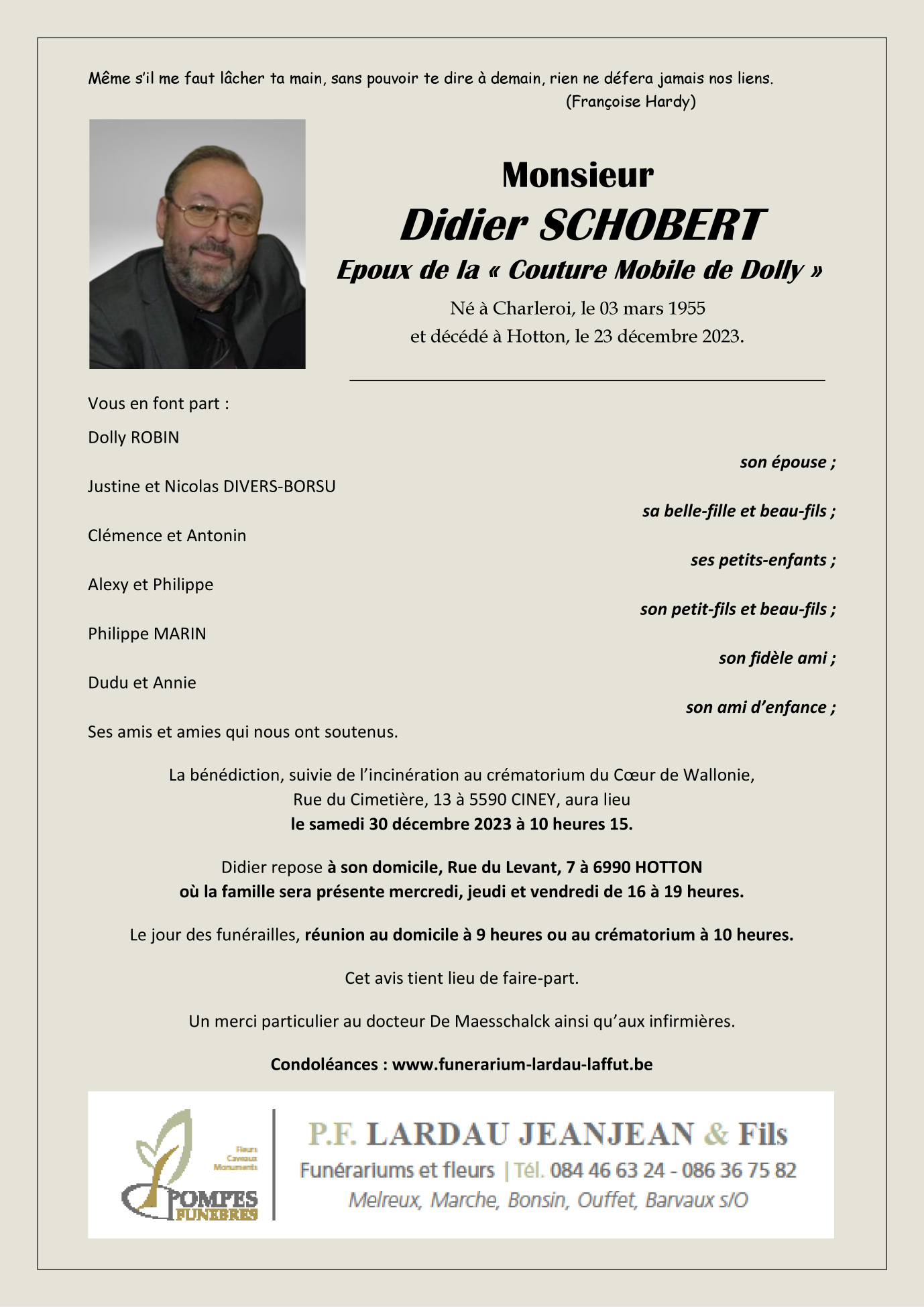Décédé à Hotton (6990) le samedi 23 décembre 2023 à l'âge de 68 ans