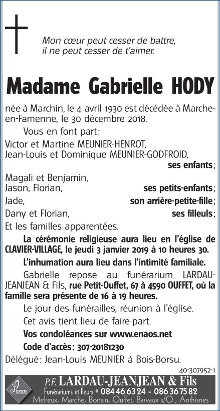 Décédée à Marche-en-Famenne (6900) le dimanche 30 décembre 2018 à l'âge de 88 ans