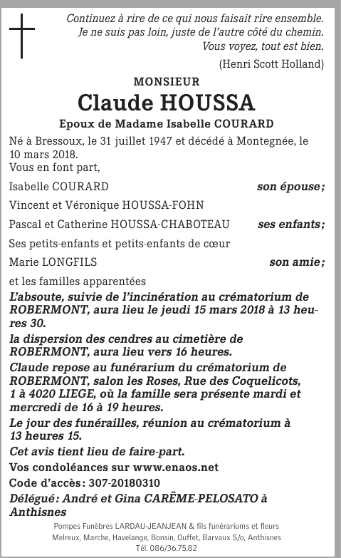 Décédé à Montegnée (4420) le samedi 10 mars 2018 à l'âge de 70 ans