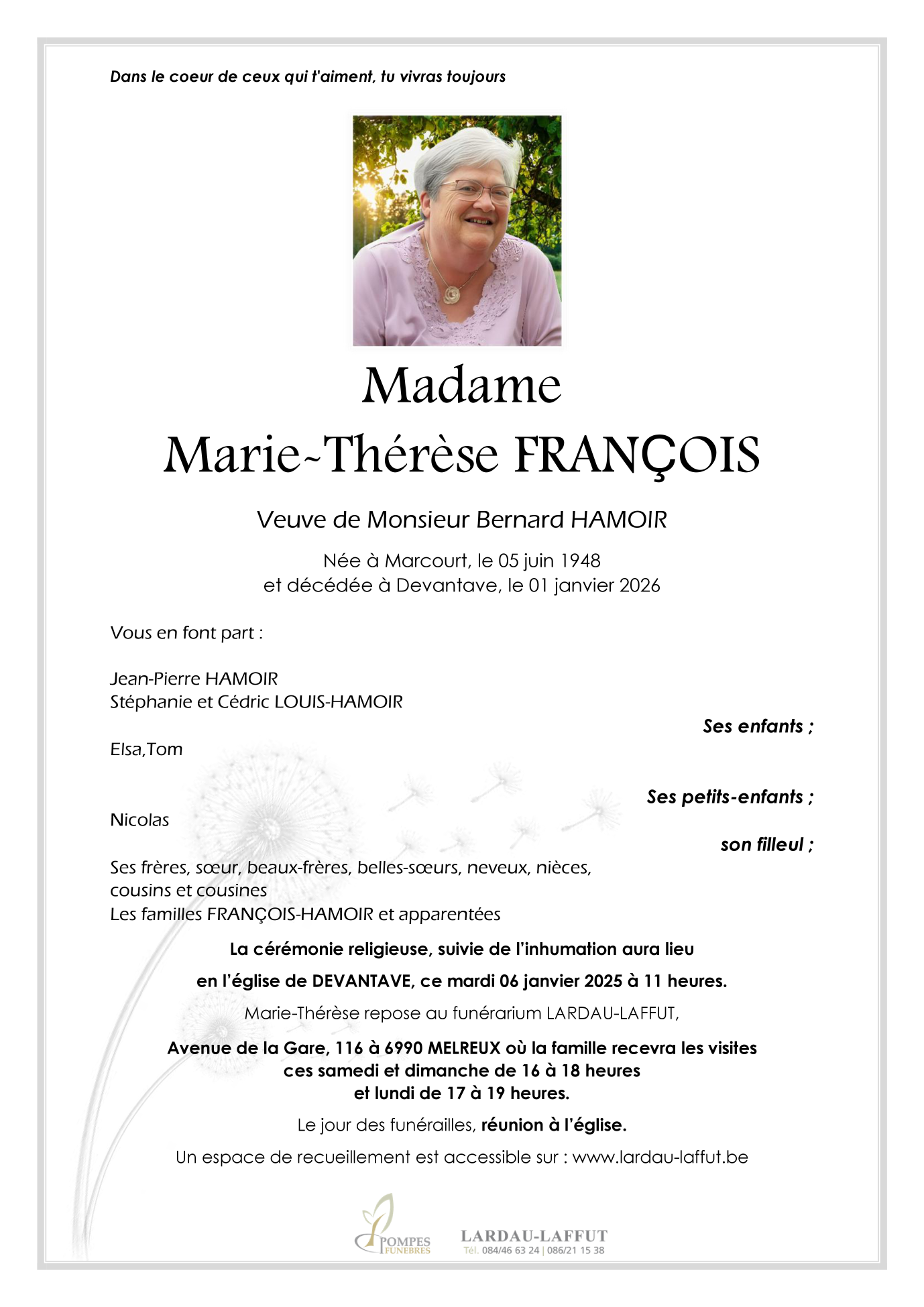Veuve de Monsieur Bernard HAMOIR