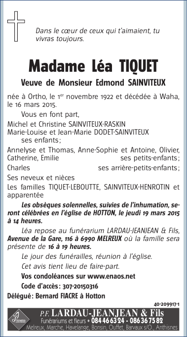 Décédée à Waha (6900) le mardi 17 mars 2015 à l'âge de 92 ans